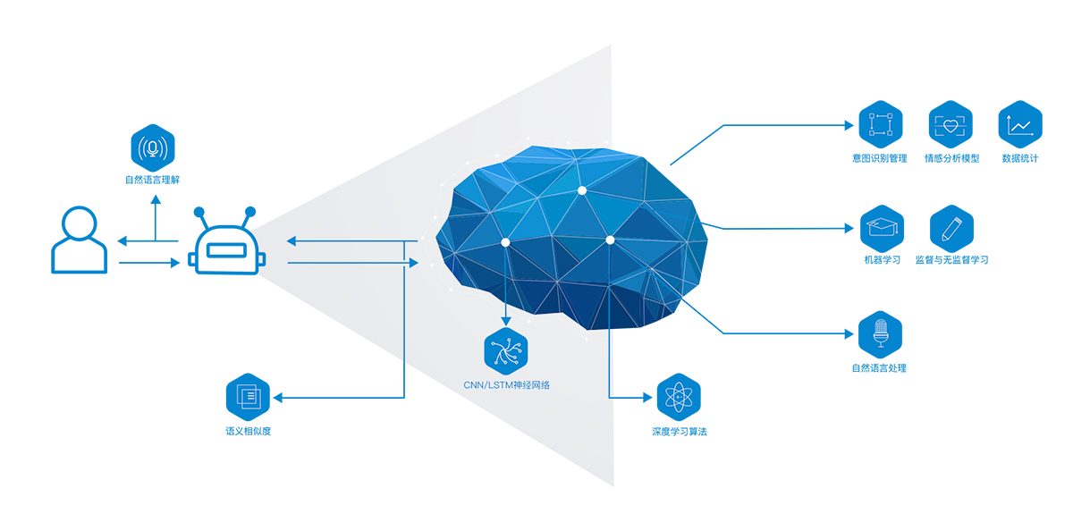 基于CNN/LSTM神经网络,理解上下文语境,针对复杂业务场景,理解客户意图,以智能流程引导访客进入下一轮会话,利用业务知识规则帮助访客解决实际问题。